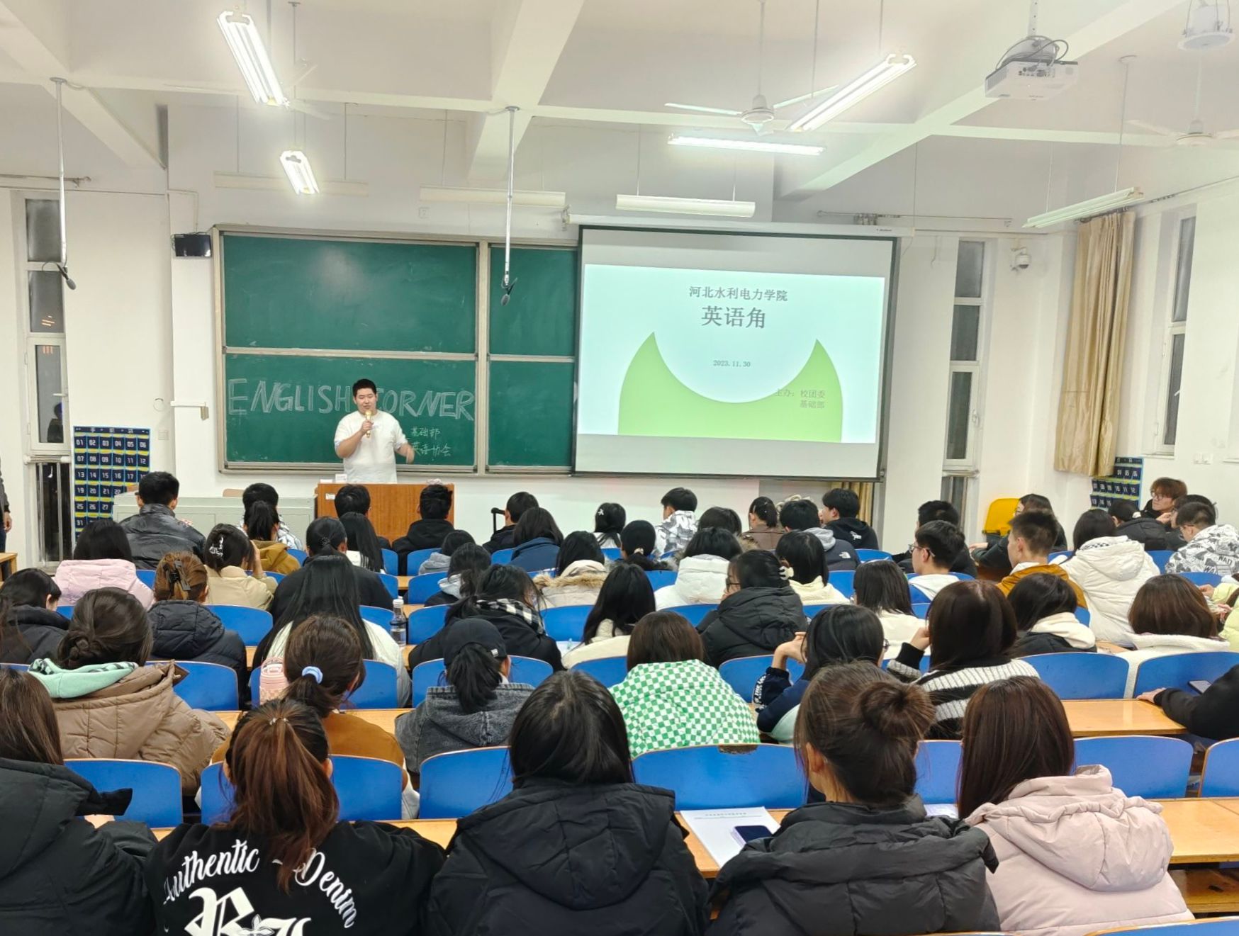为促进学生英语口语表达能力的提升,丰富校园文化生活,我校于11月30日晚7点在创新楼举办了一场精彩纷呈的英语口语角活动,本次活动由校团委和基础部共同主办,英语协会对此次活动进行了组织策划。基础部英语教师刘建怀和苏畅主持了此次活动,为学生们解答疑惑,提供专业的口语建议,帮助学生更好地理解和运用英语,提升口语水平。 本次活动吸引了80名左右学生的积极参与,现场热闹非凡。参与者们纷纷展示了自己独特的口语风采,展现了学习英语的热情和信心。...