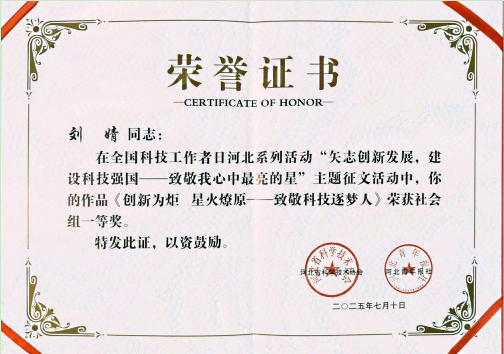 近日,河北省科学技术协会与河北青年报社联合公布的全国科技工作者日主题征文活动评选结果揭晓,我校师生表现出色,最终评选出社会组一等奖1个,学生组一等奖2个,三等奖1个,优秀奖2个。在社会组比赛中,我校教师刘婧凭借《创新为炬 星火燎原—致敬科技逐梦人》一文,以深刻立意和生动笔触,荣获一等奖,展现了我校教师对科技精神的深刻理解与弘扬决心。学生组同样成绩斐然,董宸宇、杜新丰两位同学分别以《创客空间的灯 点亮星辰大海》...