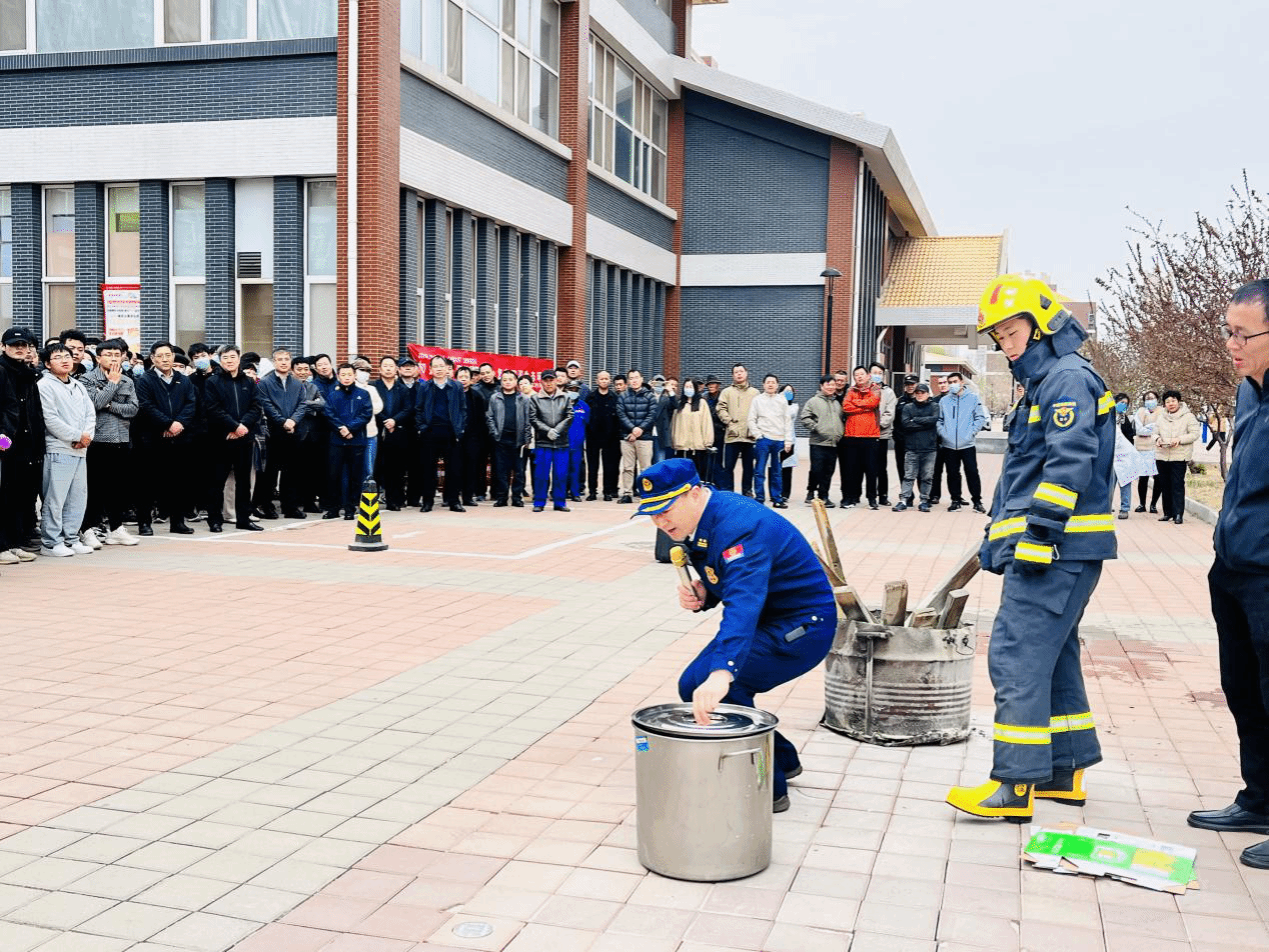 点评结束后,赵江奎和8名消防员通过解说和现场演示的方式为师生员工详细讲解了灭火原理、四种灭火方法、灭火器的种类和使用方法,随后,全体参演人员使用灭火器进行了灭火。