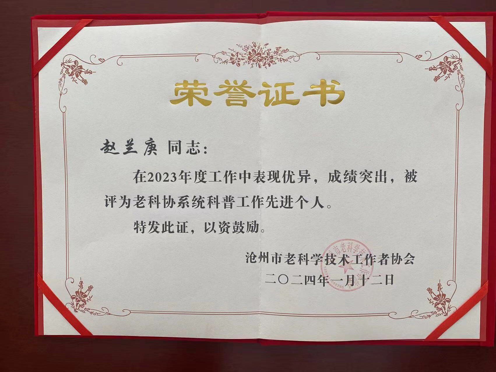 在近日召开的沧州市老科技工作者协会三届六次常务理事会议上,我校老科技工作者协会被评为2023年度老科协工作先进集体,赵兰庚同志被评为先进个人。