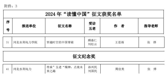 2024年,教育部关工委在全国高校开展以“教育强国,奋斗有我”为主题的“读懂中国”活动,我校关工委积极响应并与校团委精心合作,组织我校青年学生踊跃开展征文活动。近日,河北省教育厅发布文件,经上级评选,我校关工委在此次活动中荣获优秀组织奖;王思雨同学的文章《穿越时空的中国脊梁》获优秀征文;周佳美同学的文章《传承“五老” 精神,点亮未来之路》获征文纪念奖。